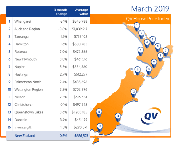 In contrast, the latest QV House Price Index shows New Zealand’s national property values grew by 2.6% over the past year and by 0.5% in the three months to March.